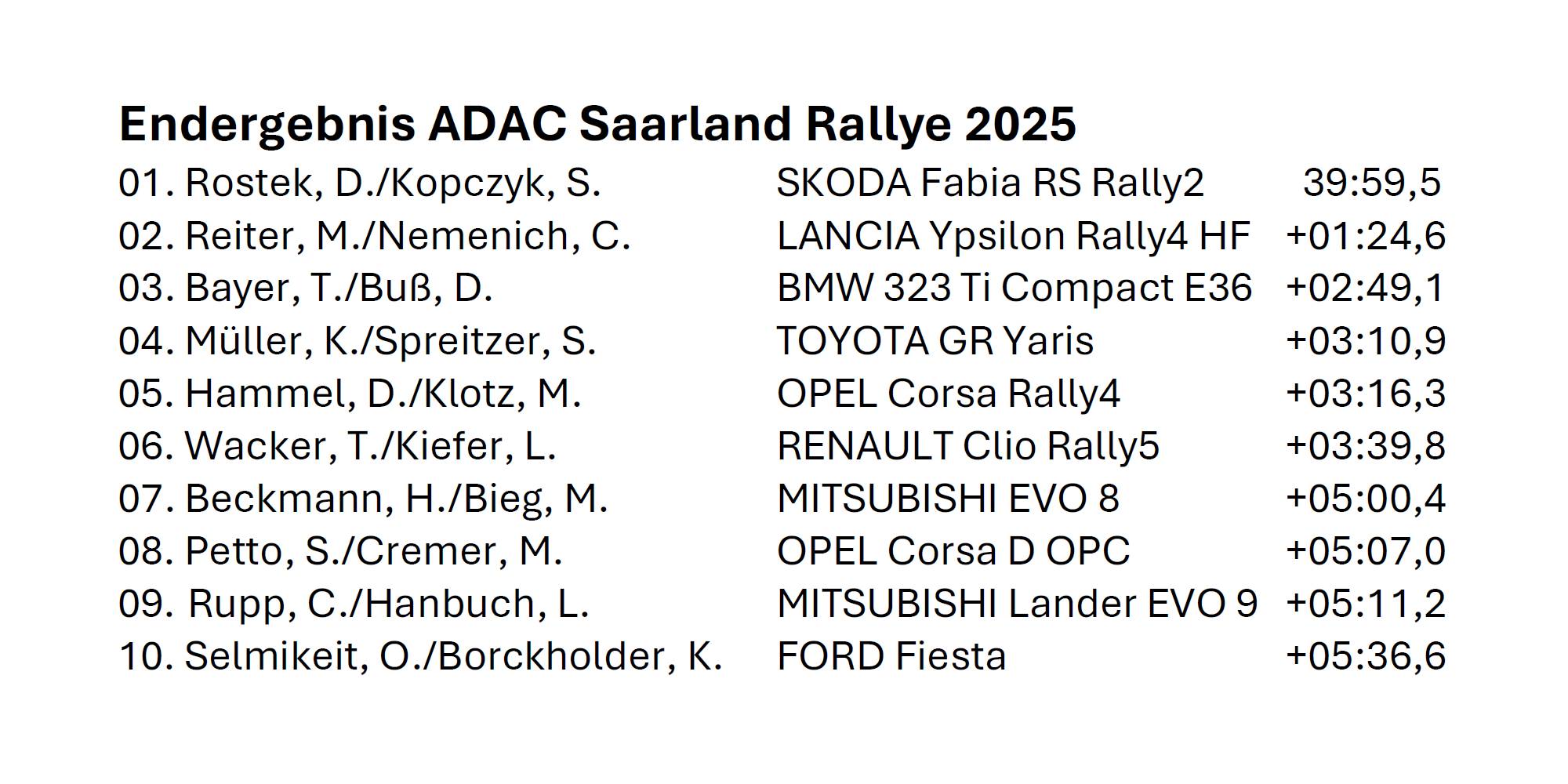 Dennis Rostek und Co-Pilot Stefan Kopczyk feierten den Gesamtsieg. Neuer Saarländischer Rallye Meister ist Max Schumann, obwohl er das Ziel der Rallye gar nicht erreichte.
